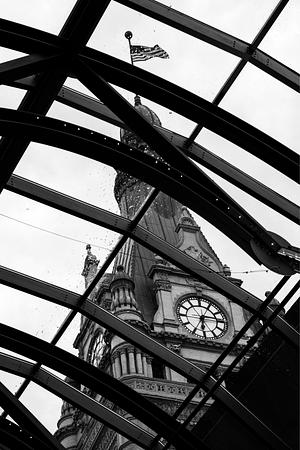 A black and white image of Milwaukee City Hall on a rainy afternoon